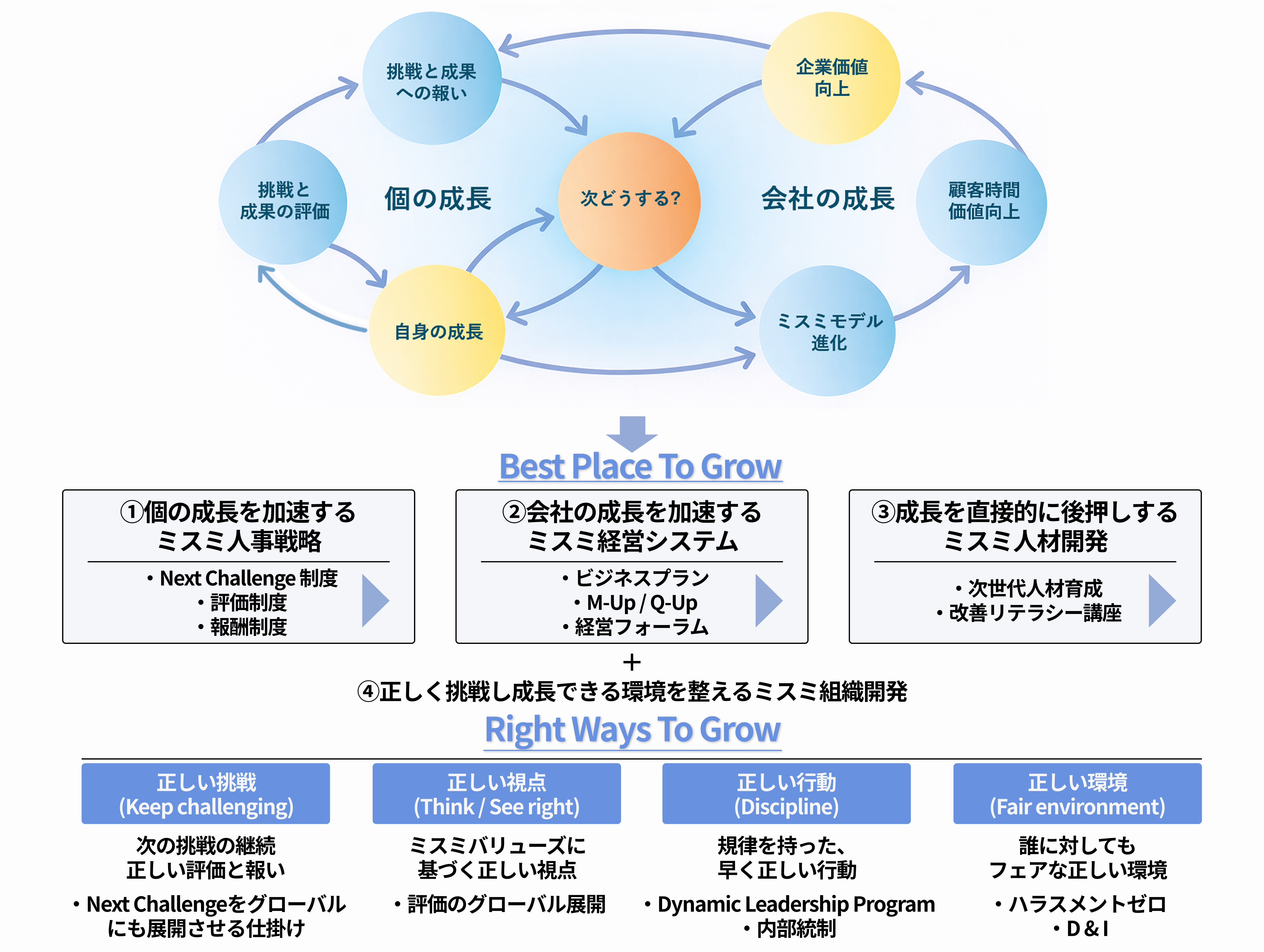 「Best Place To Grow」の実現には、同時に「正しく挑戦し成長する」という志向を伴うことが極めて重要です。正しい挑戦と成長を促す「Right Ways To Grow」の考え方を新たに加え、社員も組織も最も早く、それぞれに最も適した成長を実現する環境を整備します。