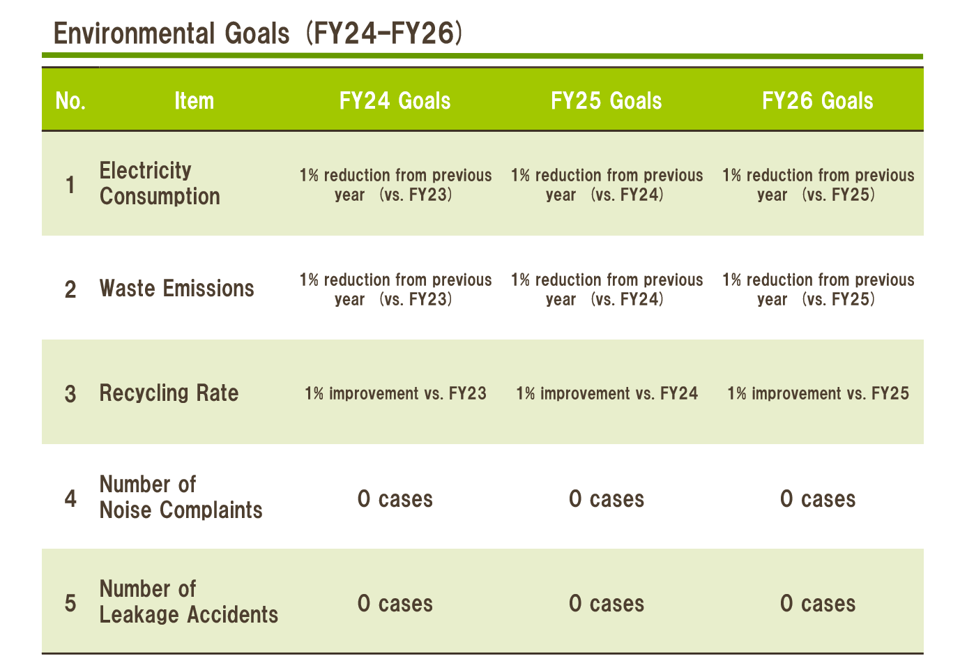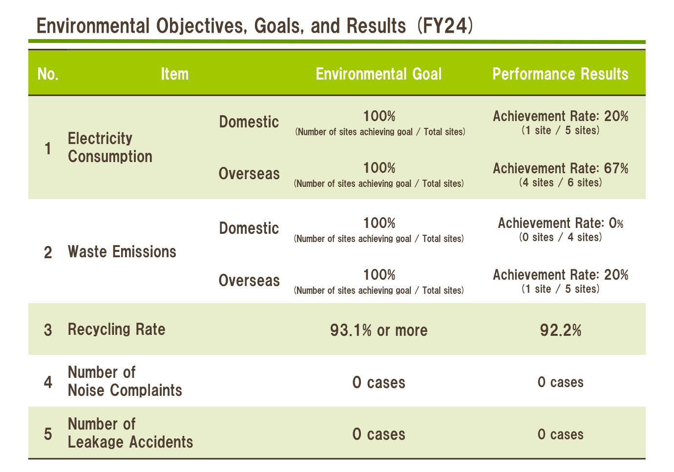 To promote practical environmental improvement activities, the Environmental Committee regularly holds meetings and shares environmental activity policies, environmental management KPIs, and plans and achievements of environmental improvement activities to strengthen our environmental management.