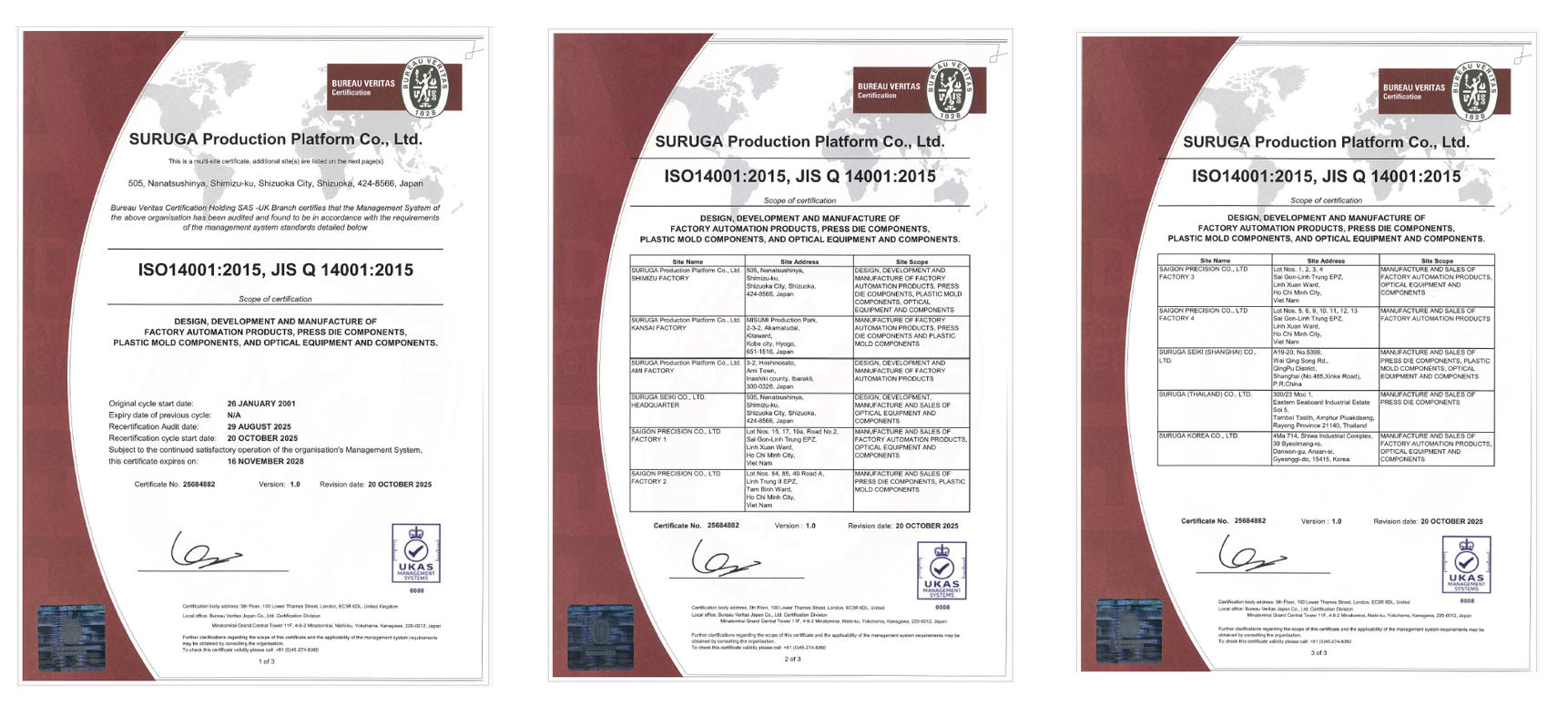 Suruga Production Platform has obtained ISO14001 certification at domestic and overseas manufacturing sites.