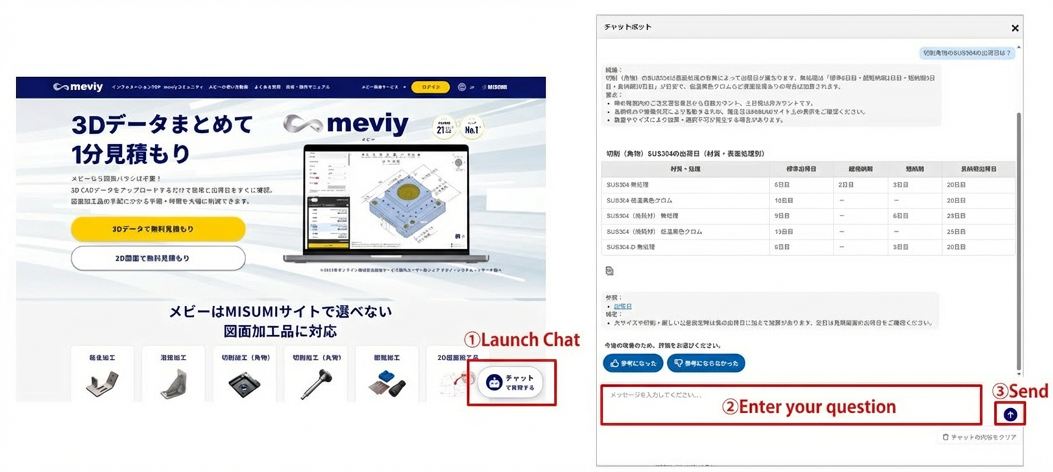 meviy, an AI-based parts procurement platform powered by MISUMI Group Inc. (“MISUMI”), has begun the full fledged rollout of its AI chatbot functionality in the Japanese market as of February 24, 2026. Using a large language model (LLM), the service interprets customer inquiries and instantly delivers optimal answers drawn from more than 300 pages of technical and operational manuals. The feature is already available in North America, with further regional expansion planned.
