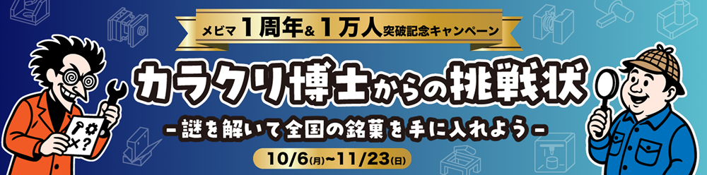 日本最大級の製造業マーケットプレイス「meviy(メビー)マーケットプレイス」(サービス提供元:株式会社ミスミグループ本社)は、2025年10月6日から11月23日までの期間、1周年&利用者1万人突破を記念して2つのキャンペーンを実施します。期間中に配信される謎に正解したお客さまの中から抽選で150名さまに、全国の銘菓をプレゼントします。また、対象商品を25,000円以上購入、かつキャンペーンに応募いただいたお客さま全員に豪華賞品をプレゼントします。