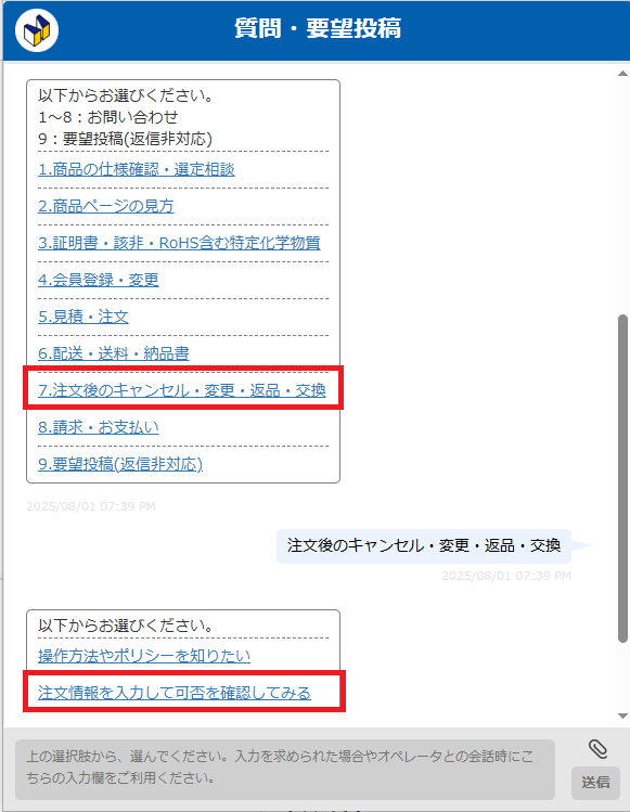 ① チャットを開き、〈7.注文後のキャンセル・変更・返品・交換〉をクリック。